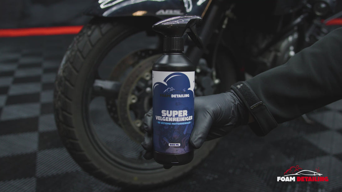 Ontdek onze Super Velgenreiniger van Foam Detailing: een neutraal, zuurvrij product dat motorlak en velgen efficiënt reinigt. Met zijn unieke samenstelling zorgt het voor een dieptereiniging en verwijdert het snel vuil- en remaanslag op de velgen, terwijl het veilig metaaldeeltjes van de motorlak verwijdert. Eenvoudig te gebruiken: spray op de lak of velgen, laat 2-5 minuten inwerken en spoel af met een krachtige waterstraal voor een grondige reiniging. Vermijd bij voorkeur gebruik in direct zonlicht voor optimale resultaten.